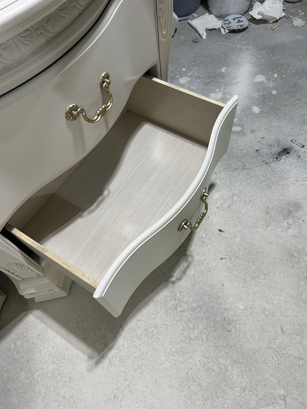 Refinished 5-drawer dresser in Cottage White with polished brass hardware, professionally updated for a timeless, elevated look. This curved-front piece offers generous storage in a refined silhouette—perfect for a bedroom, guest room, nursery, or even a statement entryway. The soft white finish paired with warm brass accents delivers classic charm with a clean, modern farmhouse feel.